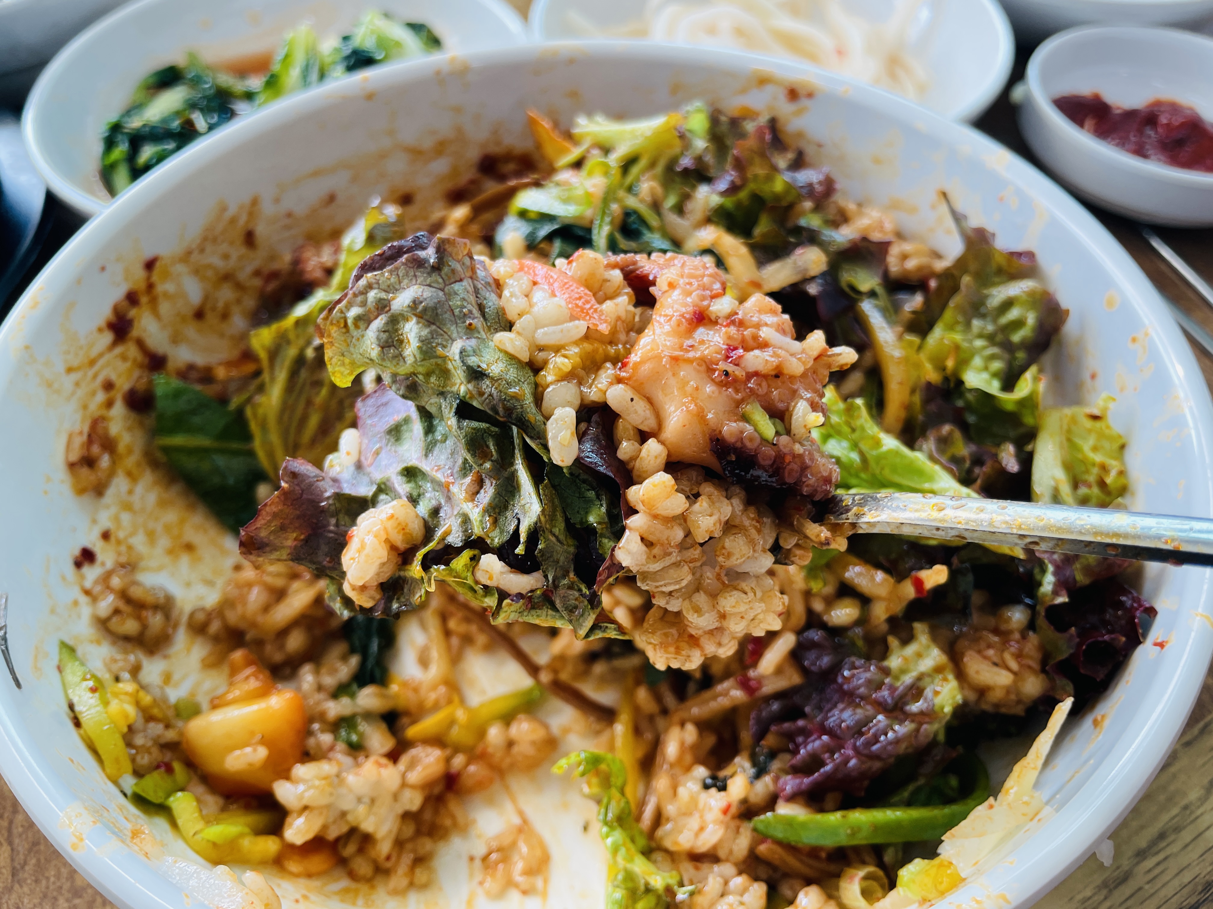 대접에 나물, 쭈꾸미, 콩나물, 상추를 모두 넣고