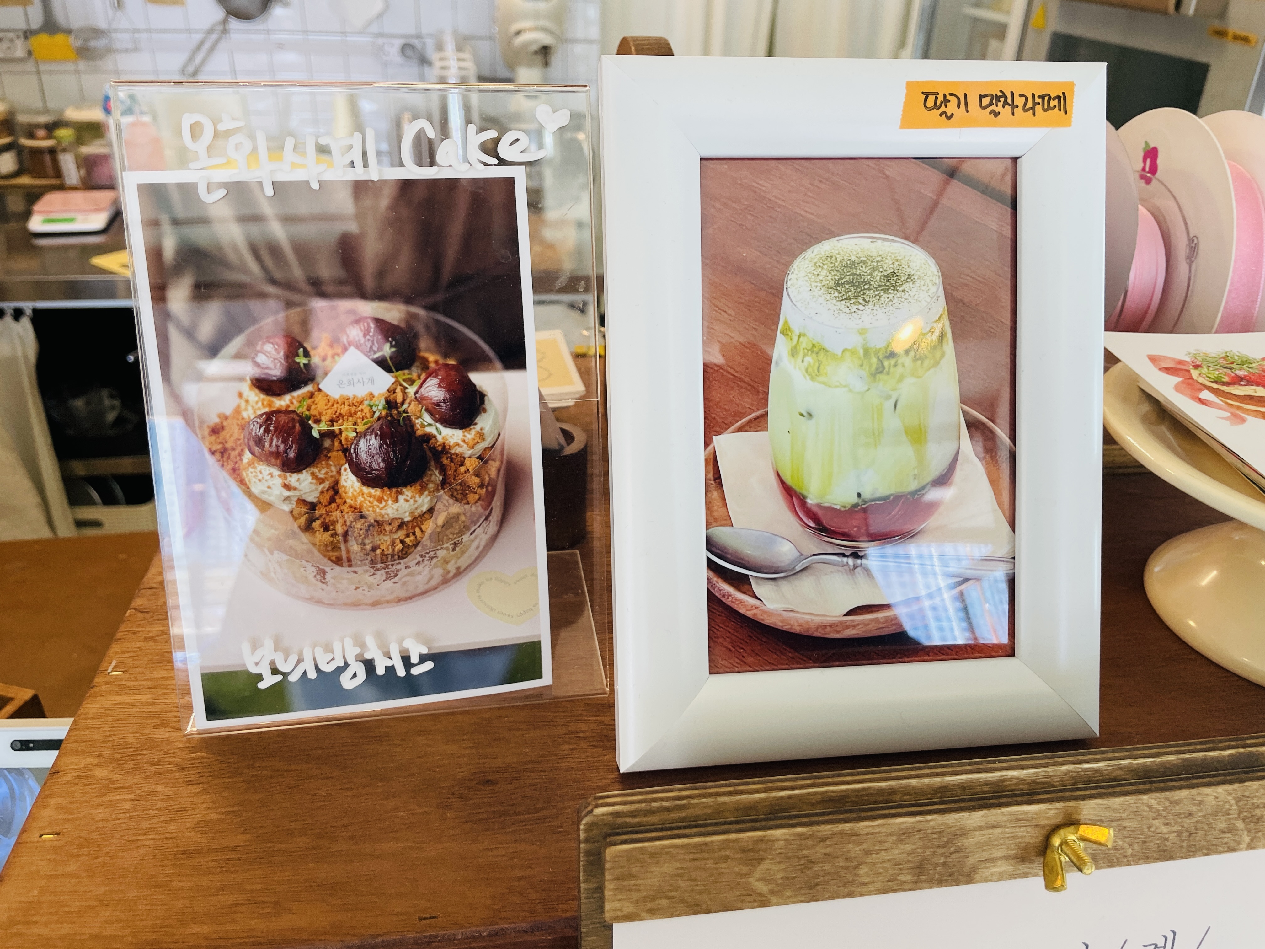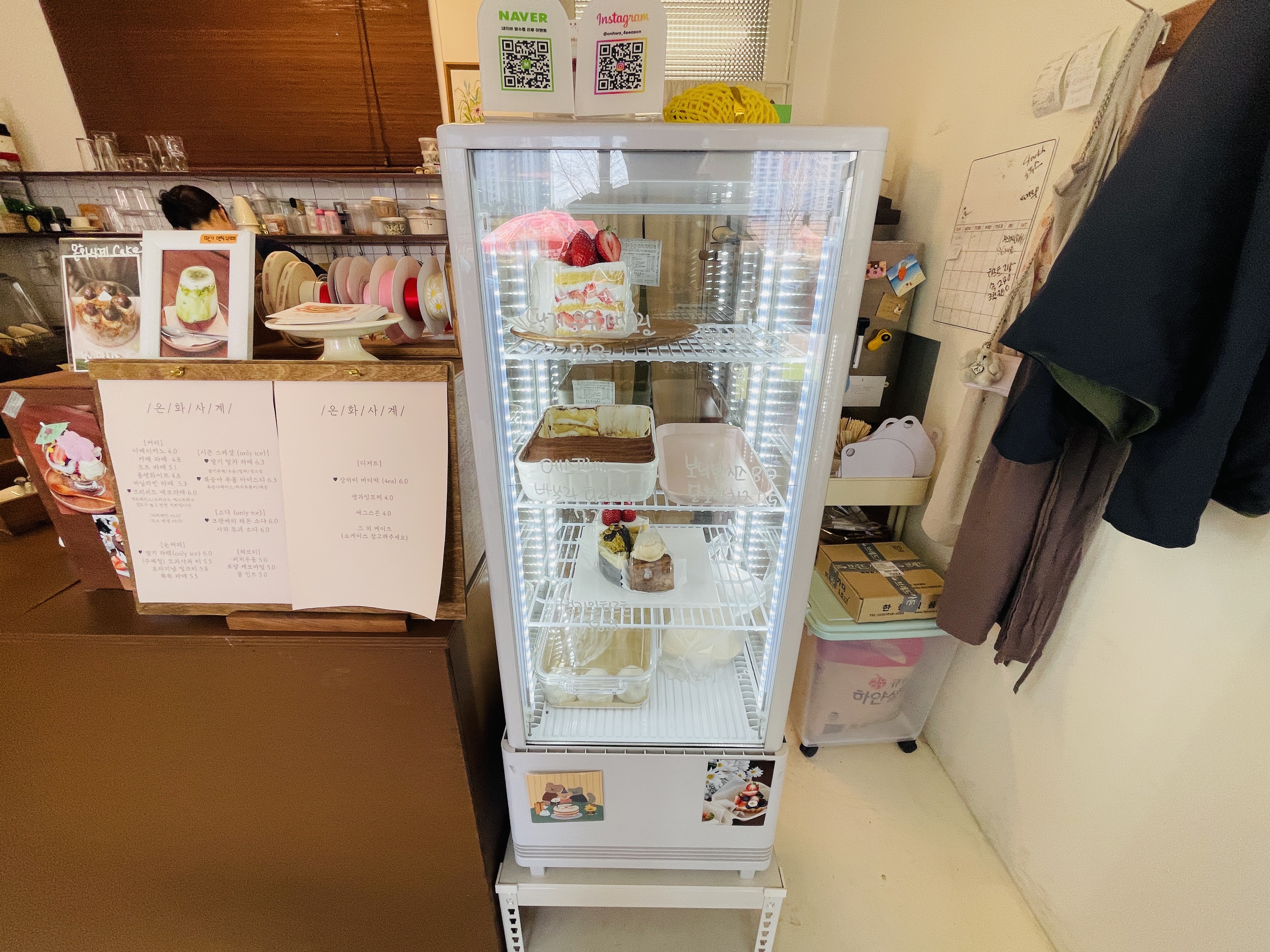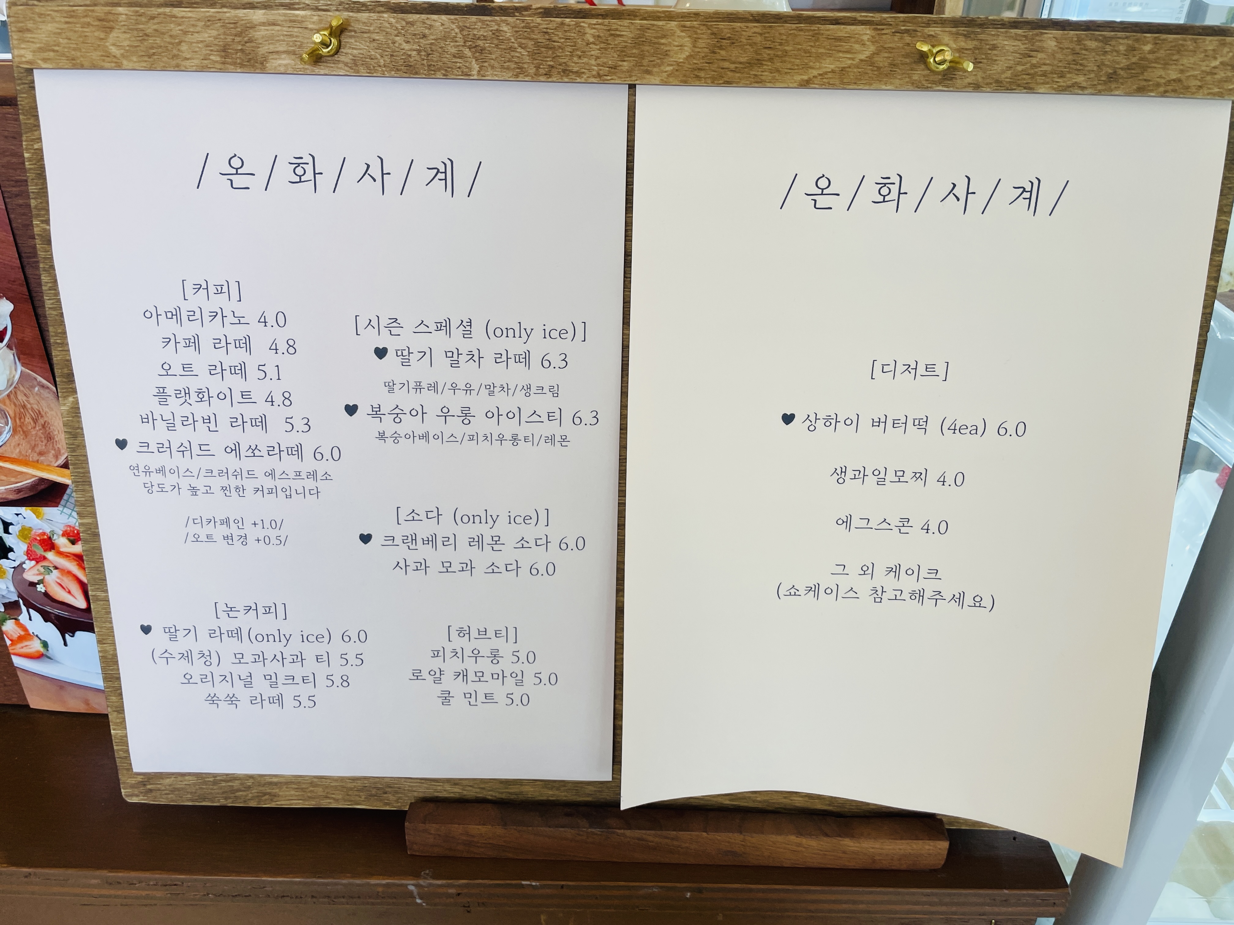온화사계 음료와 디저트 메뉴판입니다. 디저트케이스와 픽업 냉장고를 보니, 디저트 전문까페인게 느껴졌어요